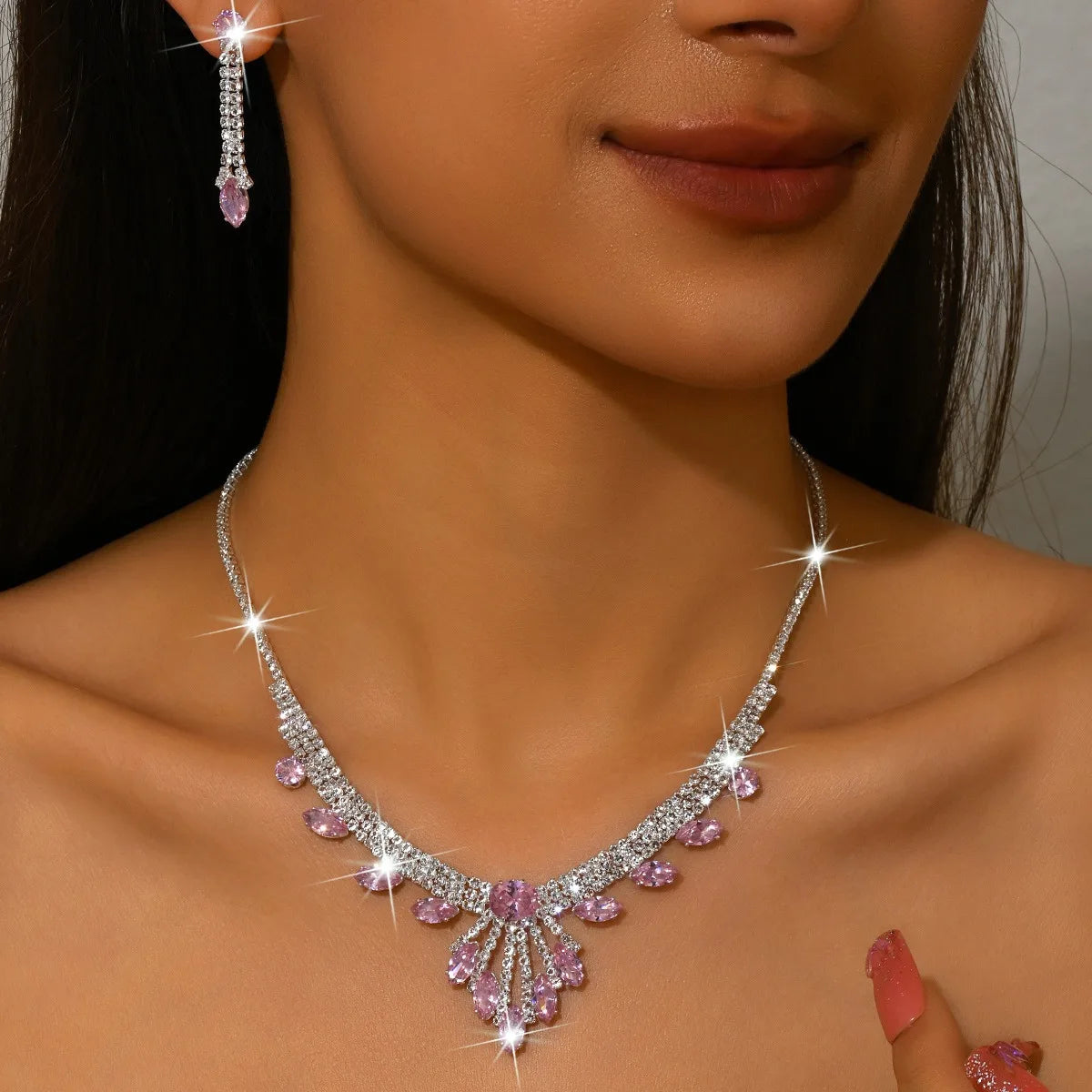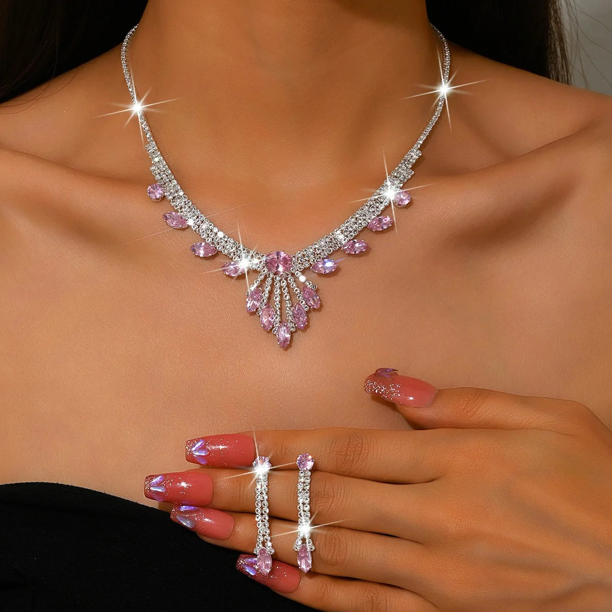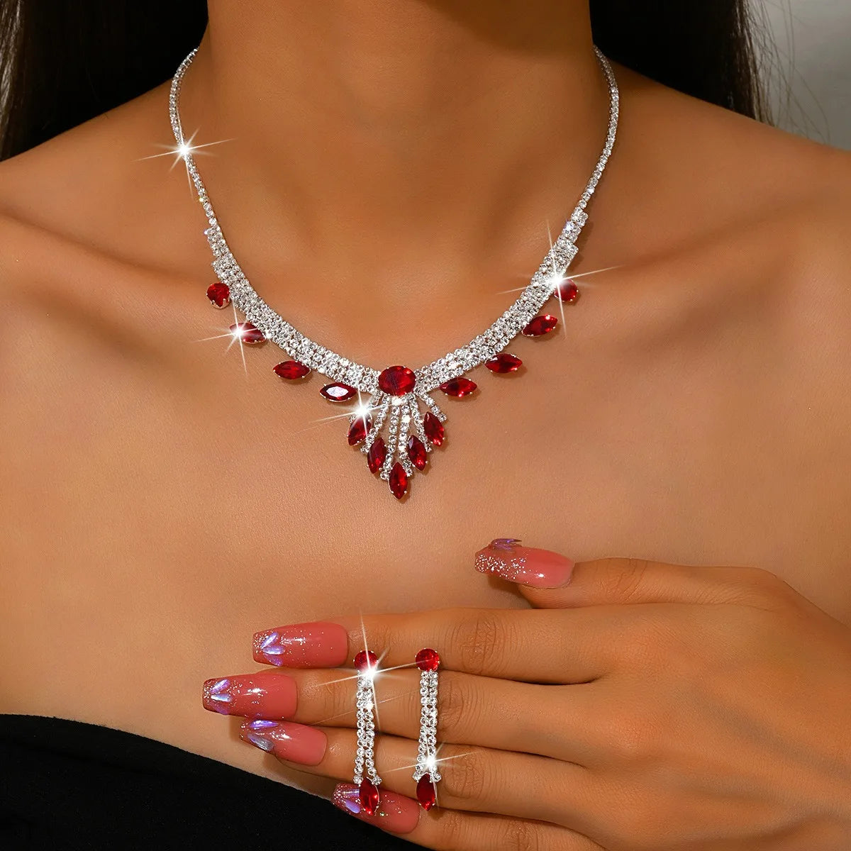 3pcs Elegant and Dignified Colored Water Droplet Gemstone Inlaid Women's Tassel Necklace Earring Set Retro Wedding Dress Jewelry