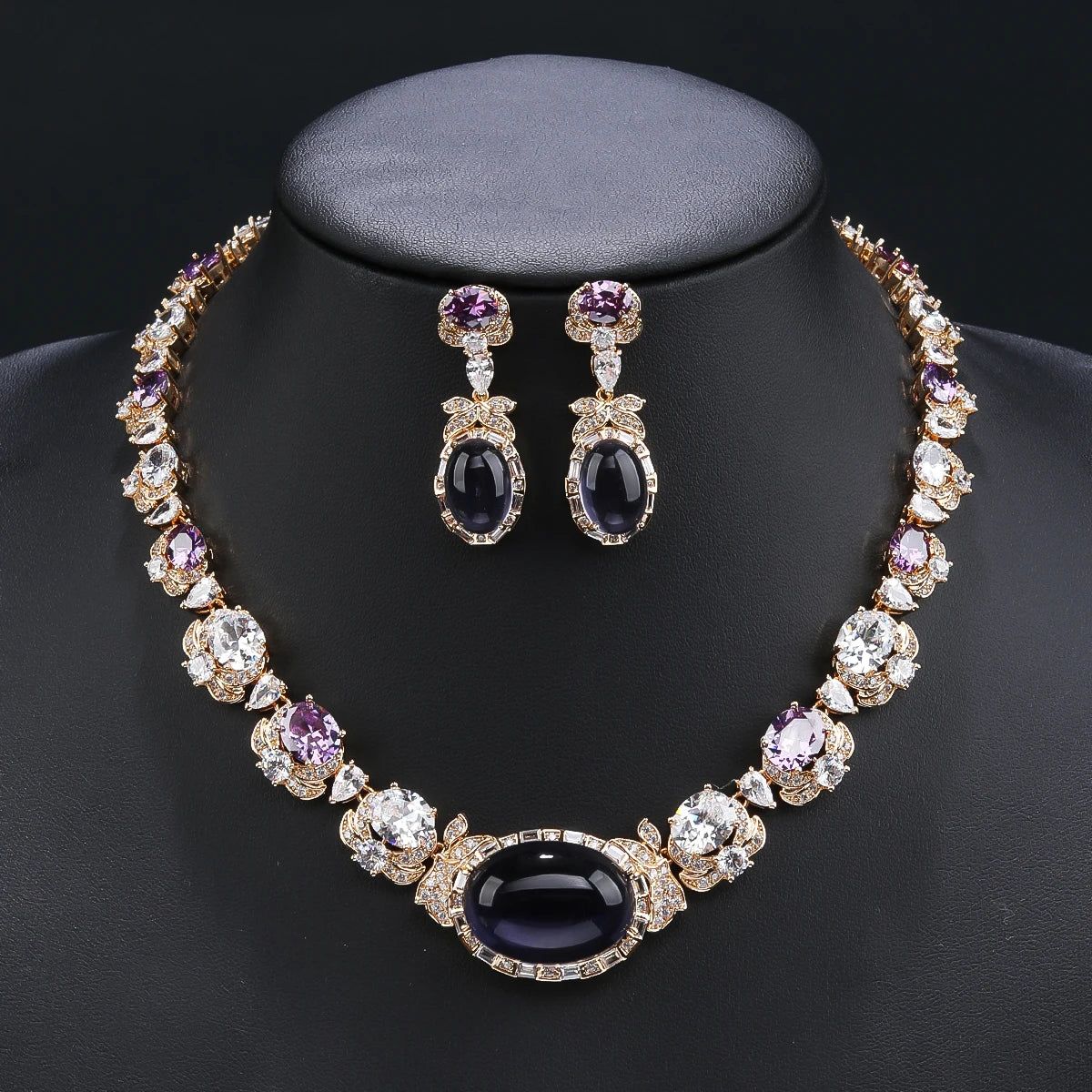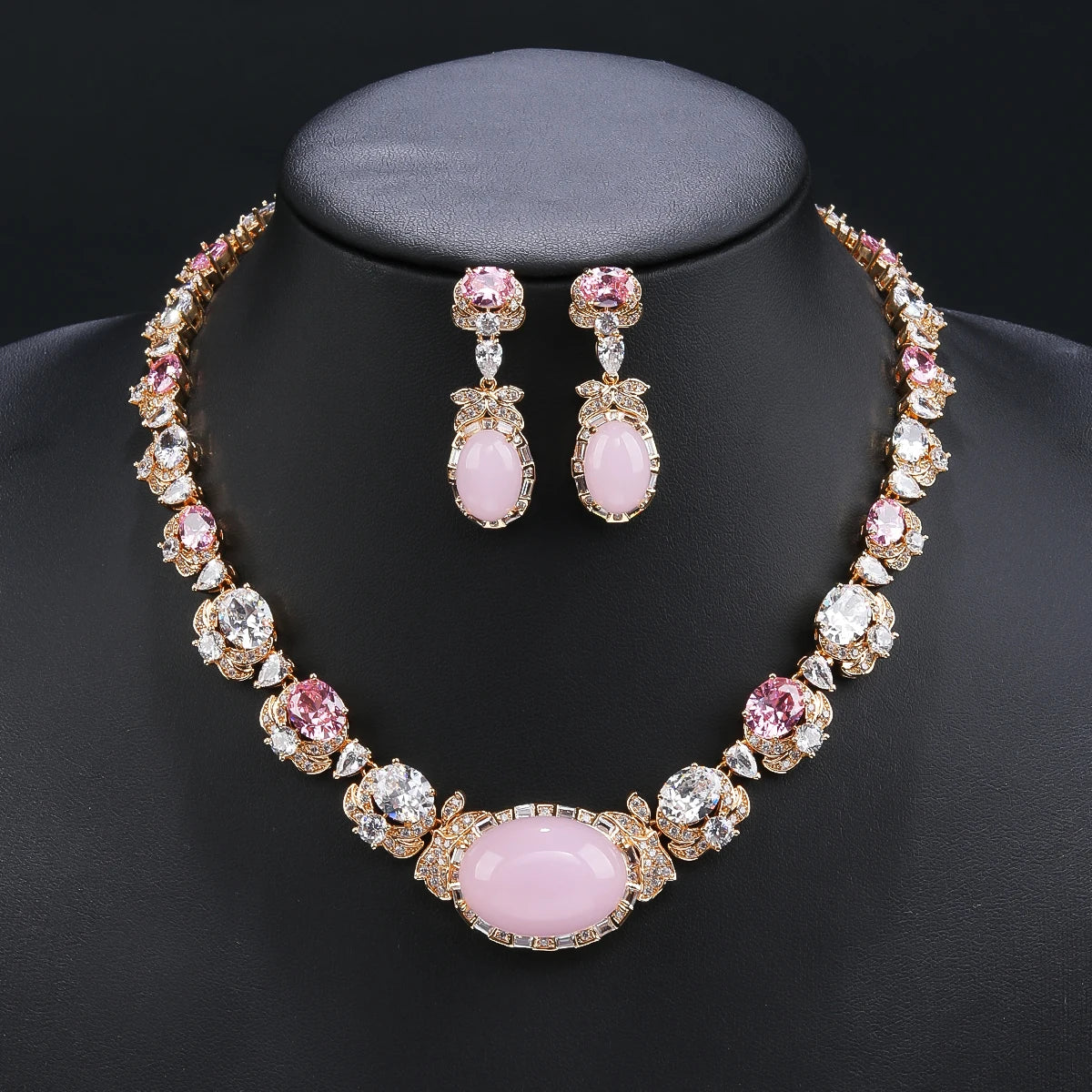 Beautiful Pink, Purple Imitation Agate Stone, Cubic Zirconia Necklace Earrings Set Bridal Wedding Jewelry Gift CN11334