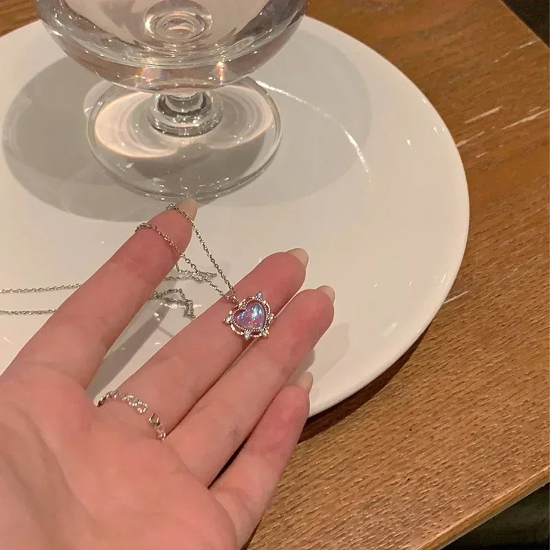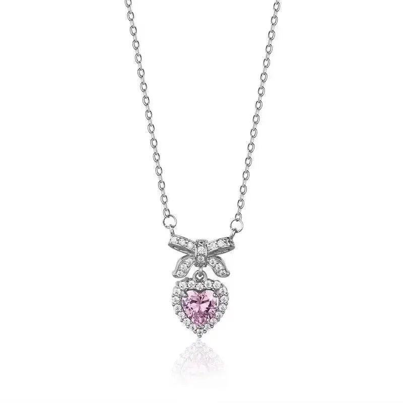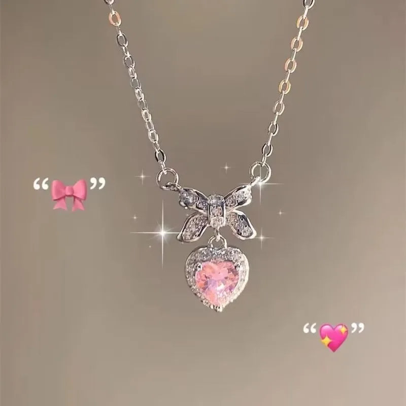 Cute Sweet Pink Bow Necklace Ladies Fashion Sparkling Rhinestone Heart Shape Pendant Clavicle Chain Delicate Wedding Accesories