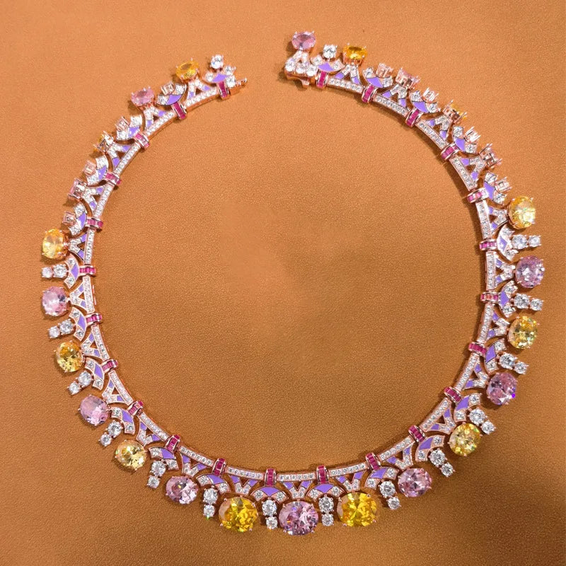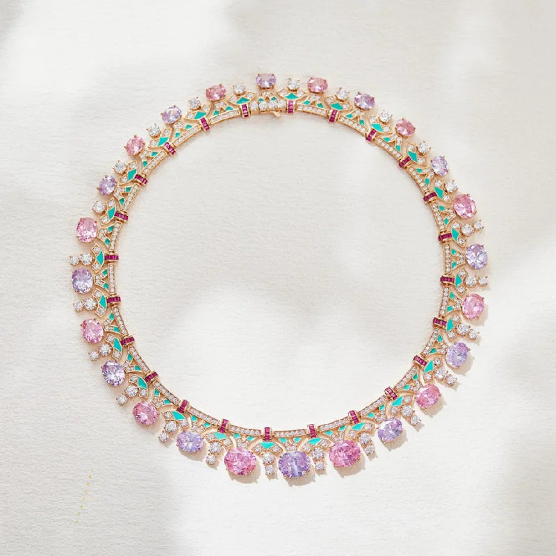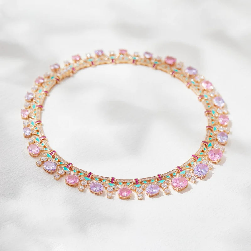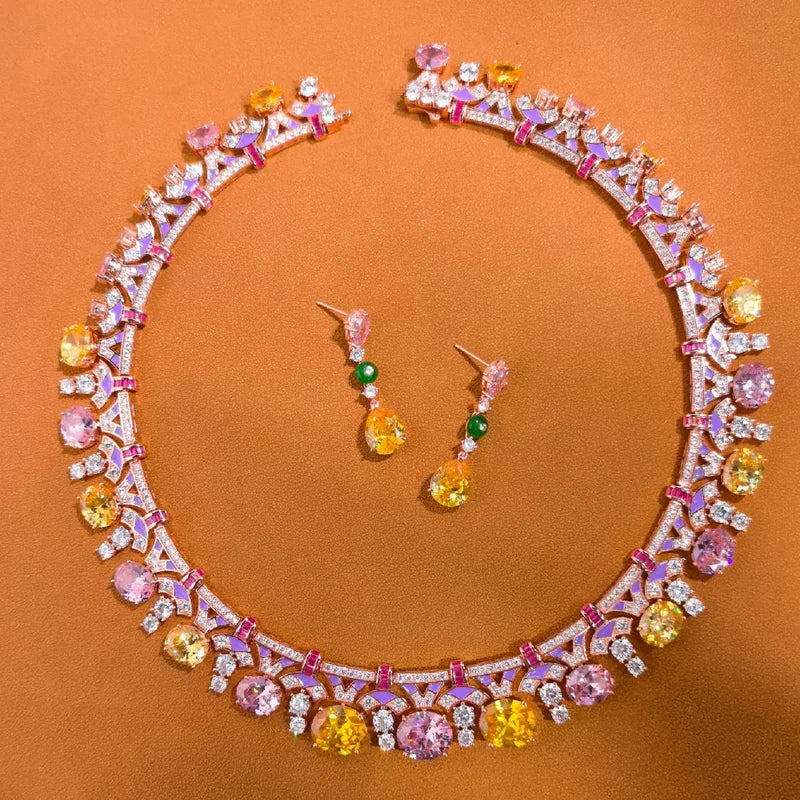 Designer Collection Style Ring Earrings Necklace Women Lady Inlay Pink Round Cubic Zircon Enamel Dinner Party Jewelry Sets