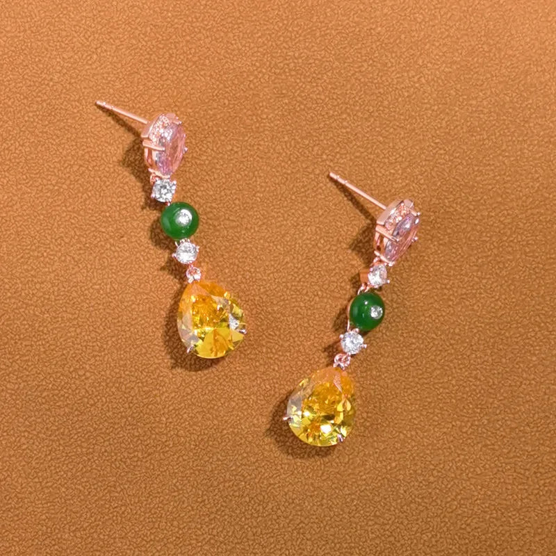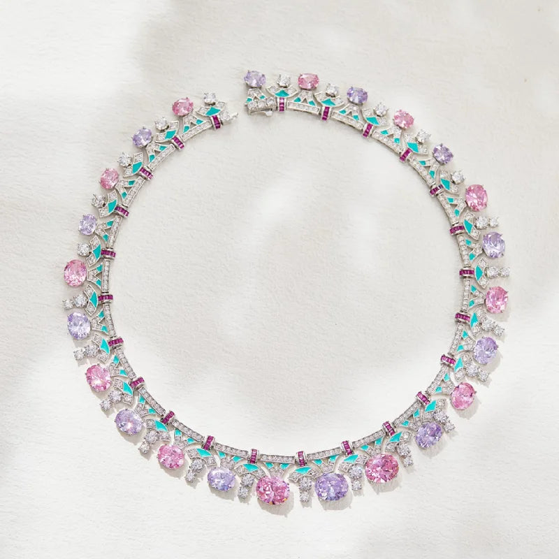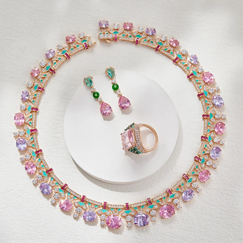 Designer Collection Style Ring Earrings Necklace Women Lady Inlay Pink Round Cubic Zircon Enamel Dinner Party Jewelry Sets