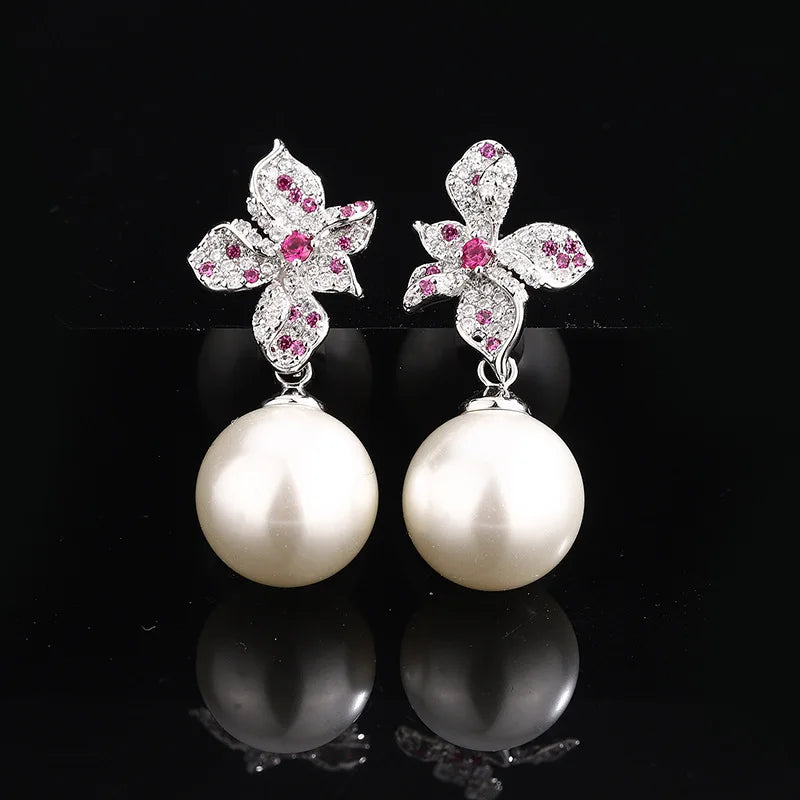 Elegant Flower White Pearl Cubic Zirconia Earrings Sparkling Necklace with Pink Crystal Ideal Wedding Dresses Accessories Gift