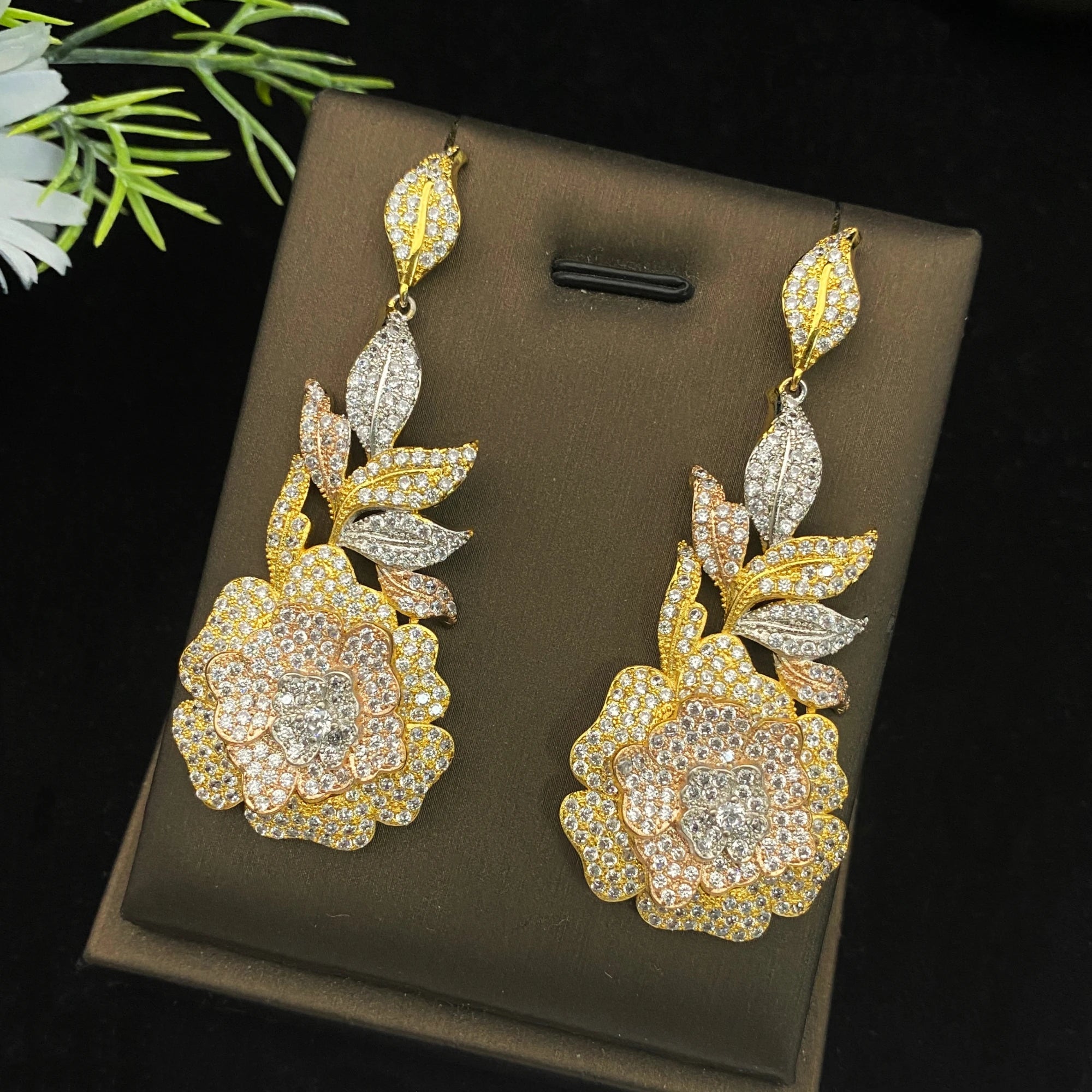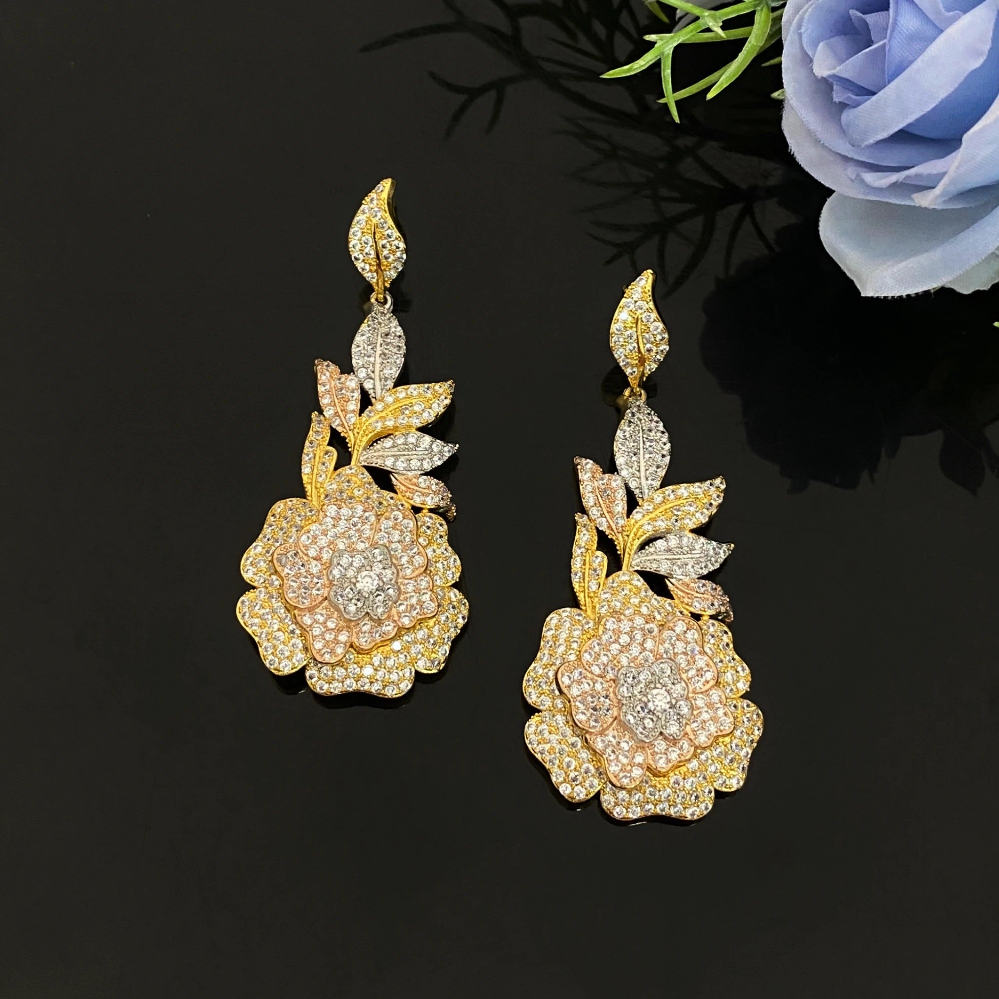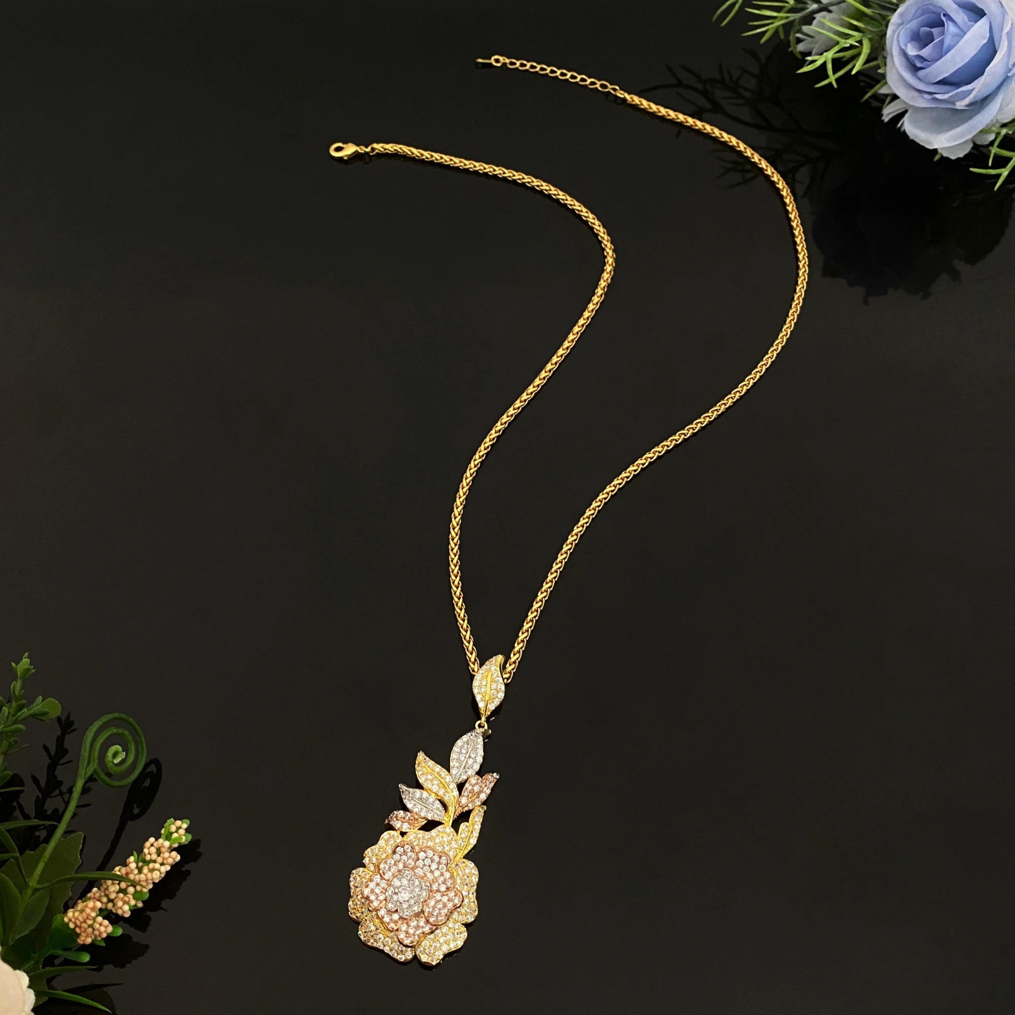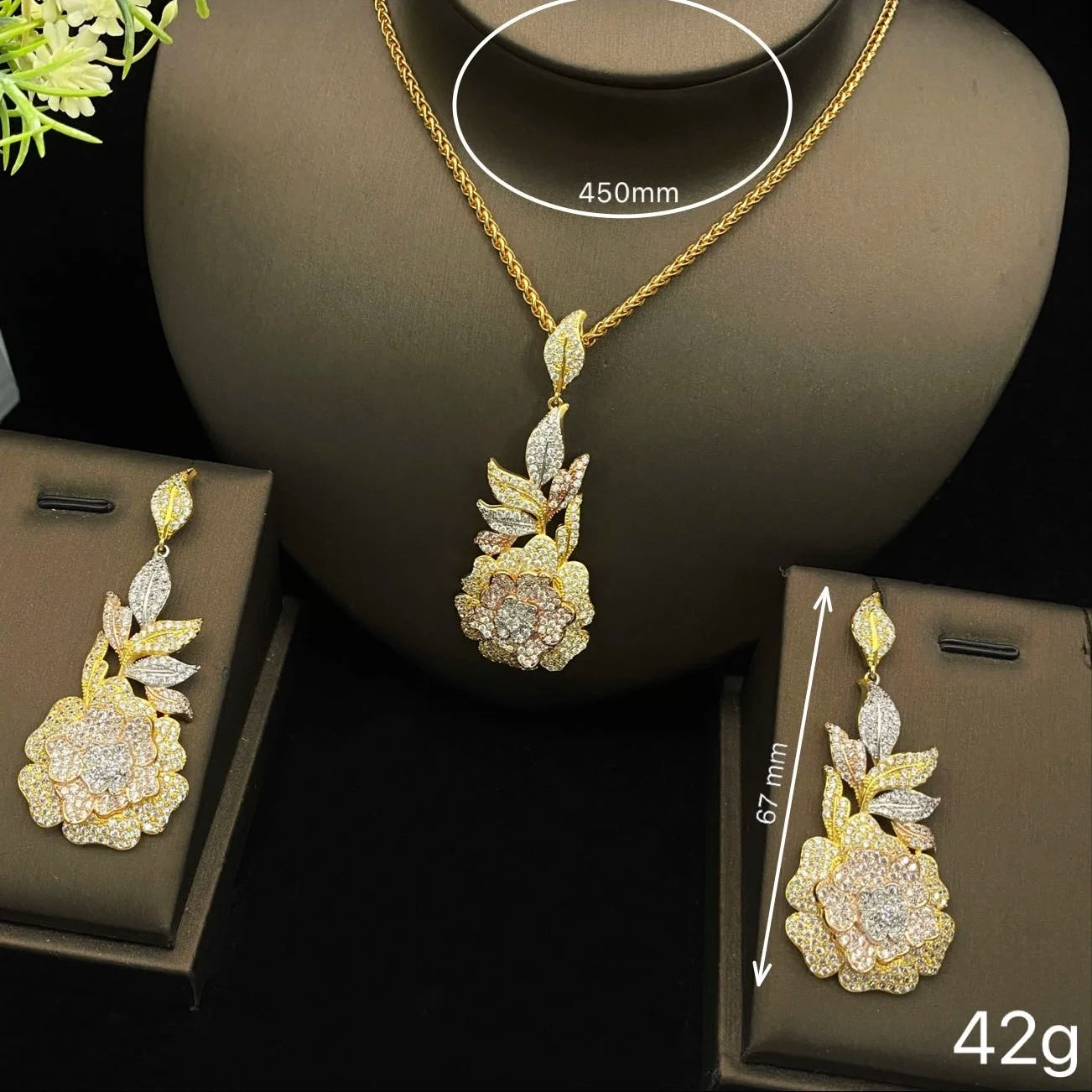 JRH Elegant Floral 2PC Jewellery Woman Set Gold Plated Zircon Flower Pendant Necklace Earrings Party Accessories Free Gift Box