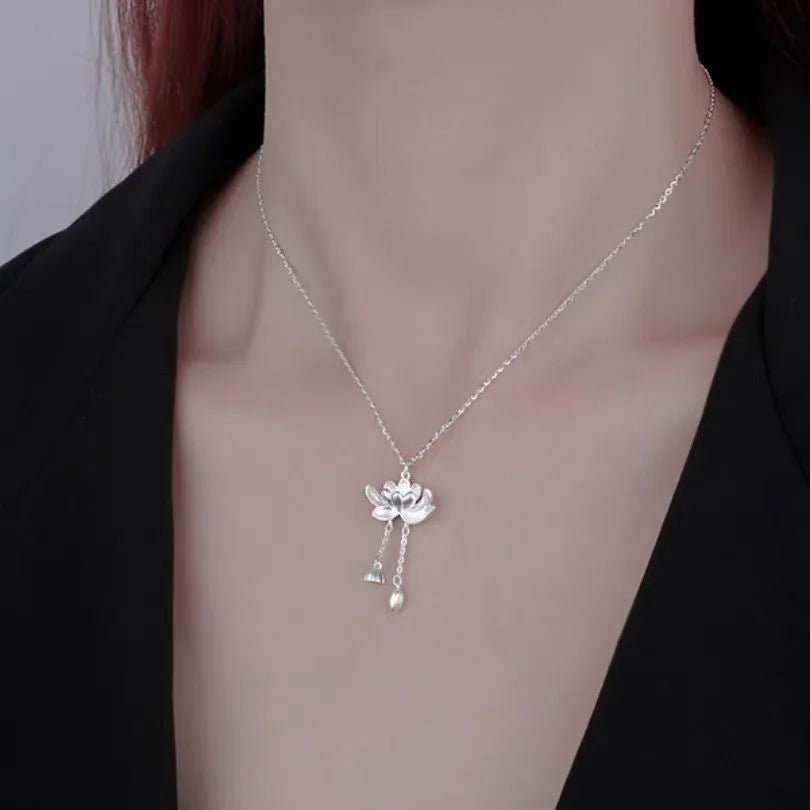 Lotus Tassel Necklace Women's New Popular Good Luck Lotus Pendant Chinese Style Elegant Flower Necklaces Jewelry Accessories