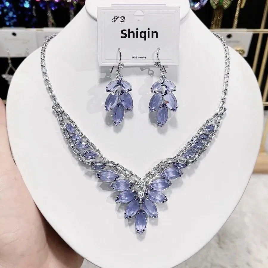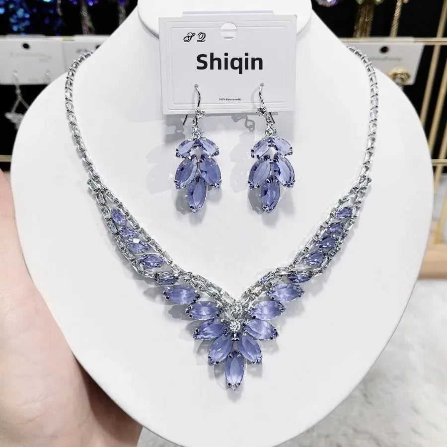 Luxurious Fashionable New Zircon Purple Transparent Color Necklace Earrings Set Versatile High-End Feelings Jewelry Accessories
