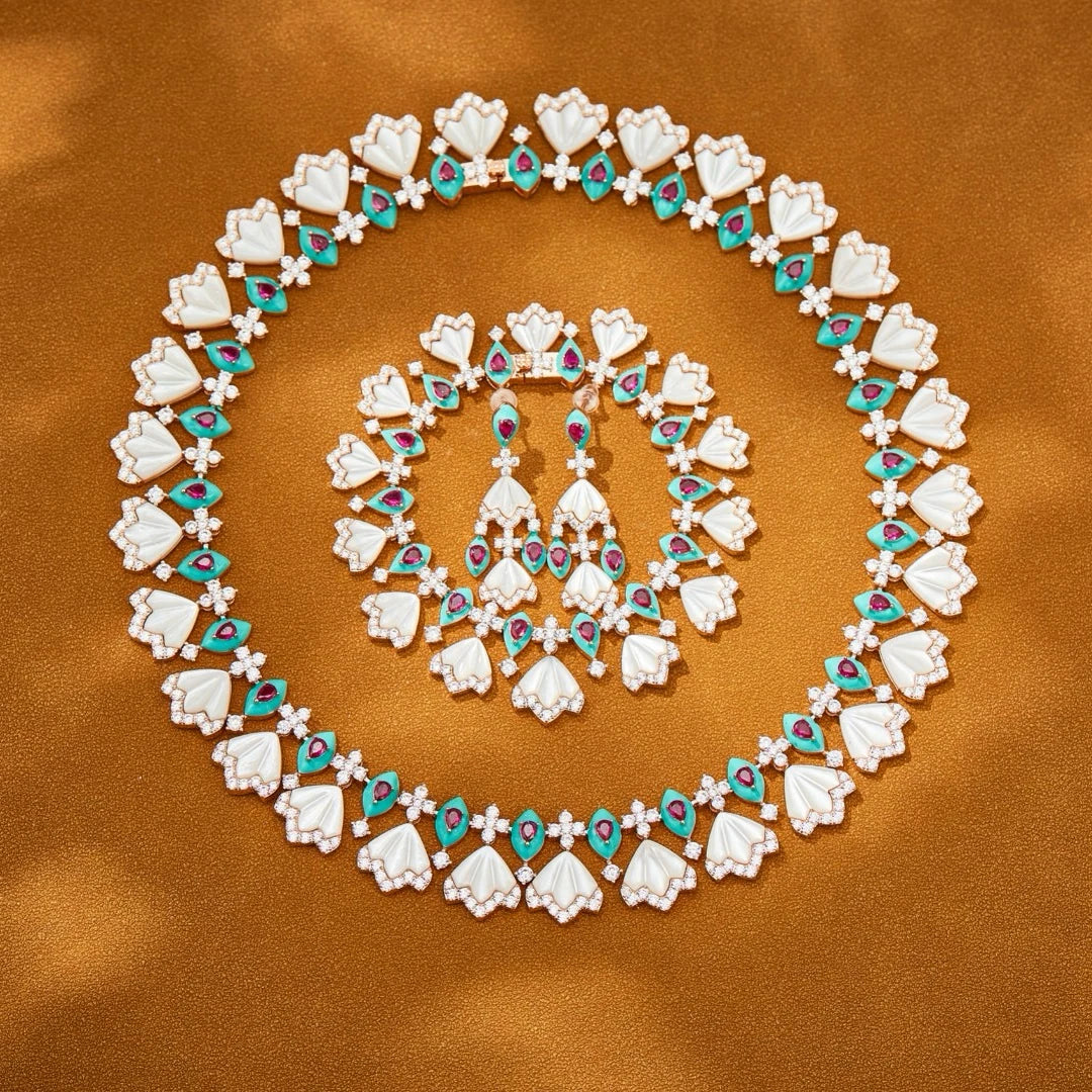 Luxury Temperament AAA Zircon Fan Shaped Blue Red Necklace Drop Earrings For Women Wedding Party Evening Dress Jewelry Sets
