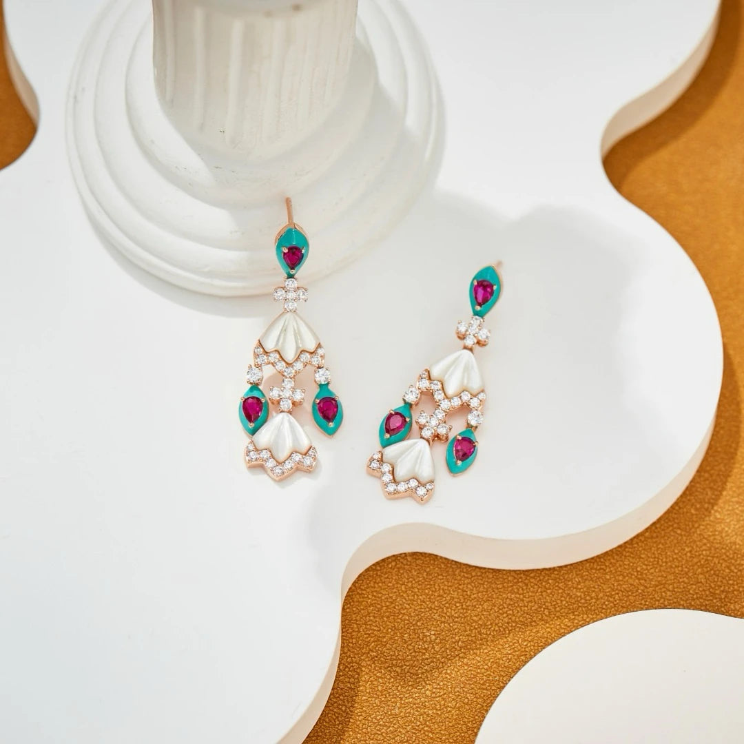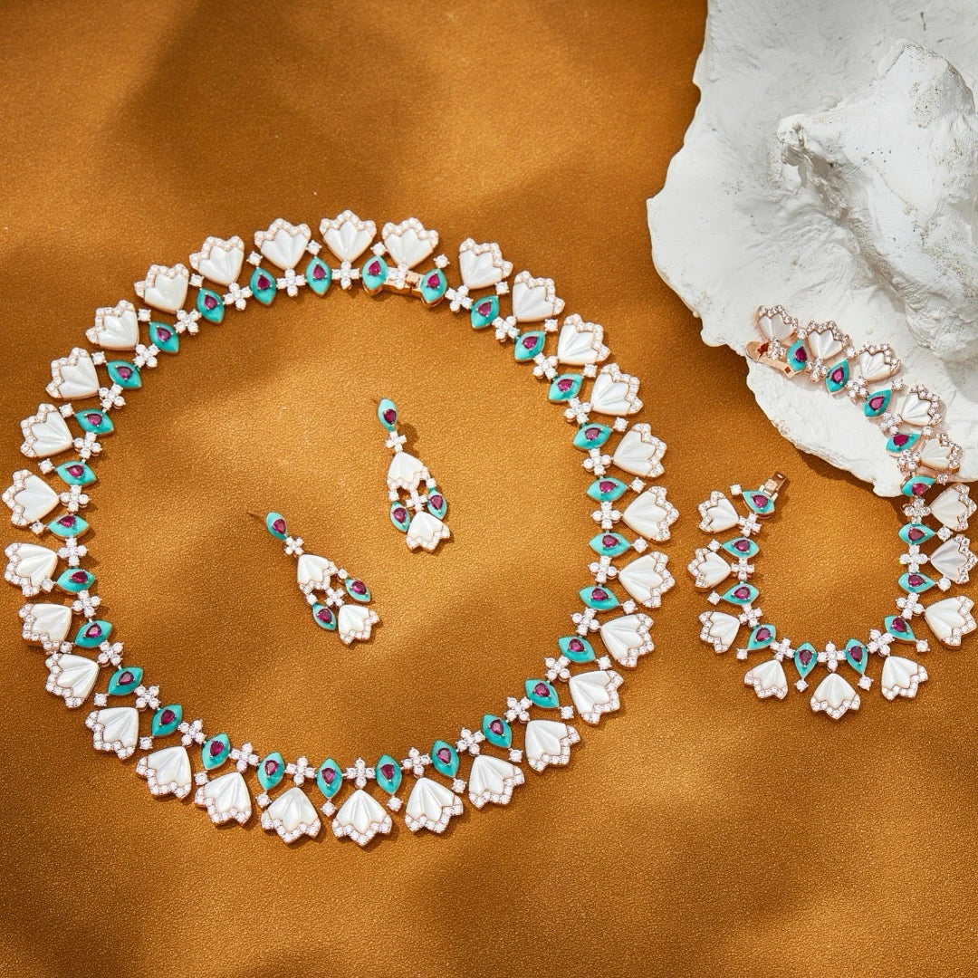 Luxury Temperament AAA Zircon Fan Shaped Blue Red Necklace Drop Earrings For Women Wedding Party Evening Dress Jewelry Sets