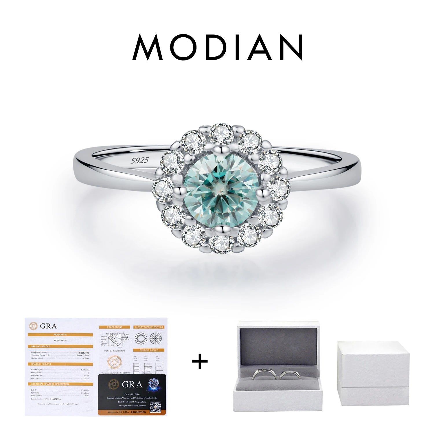 MODIAN D Color Green Teal Moissanite Halo Ring