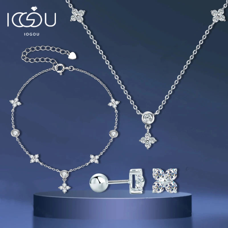 SPECIFICATIONSBrand Name: IOGOUCertificate: YesCertificate Number: Y2405037194/Y2405037119Certificate Type: GICChain Length: Necklace 40+5cm; Bracelet 16.5cm+5cmEarrings Stone Size: 3.0mm(0.10ct*8pcs)Fine or Fashion: FineGender: WomenGuarantee: As Brilliant As Mined DiamondHign-concerned Chemical: NoneItem Type: jewelry setsItem Weight: About 6-8.7gJewelry Sets Type: Necklace/Earrings/BraceletMain Diamond Material: MoissaniteMain Stone: MoissaniteMain Stone Shape: Round CutMeatal Color: White Gold Color/Yellow Gold...