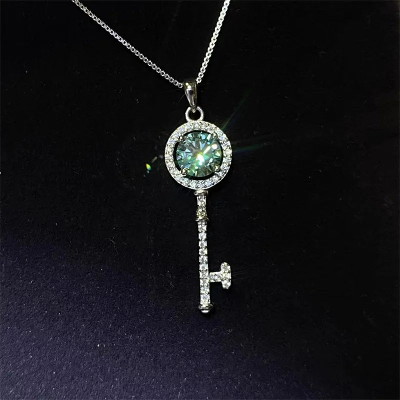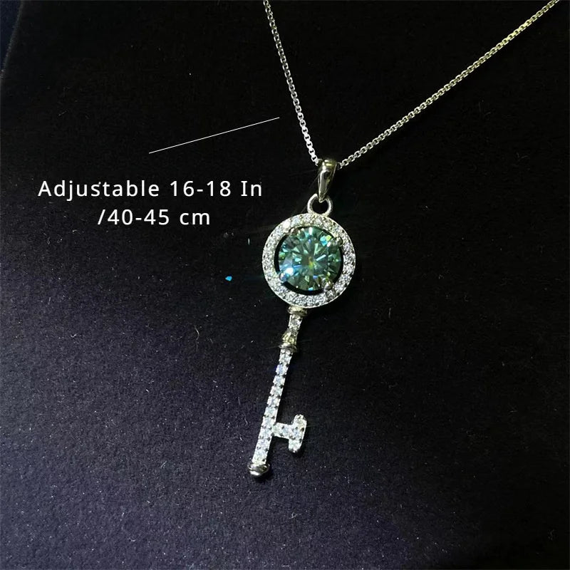 Round Shiny Blue-Green Moissanite Key Pendant Necklace, Luxury Neck Jewelry Valentine's Day Christmas Gifts For Lover