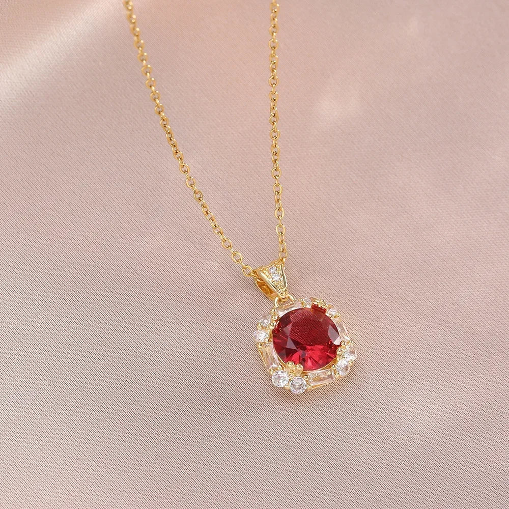 Stainless Steel Red Zircon Square Pendant Necklace for Women Girls Lovely Jewelry Accessories Gifts for Lover