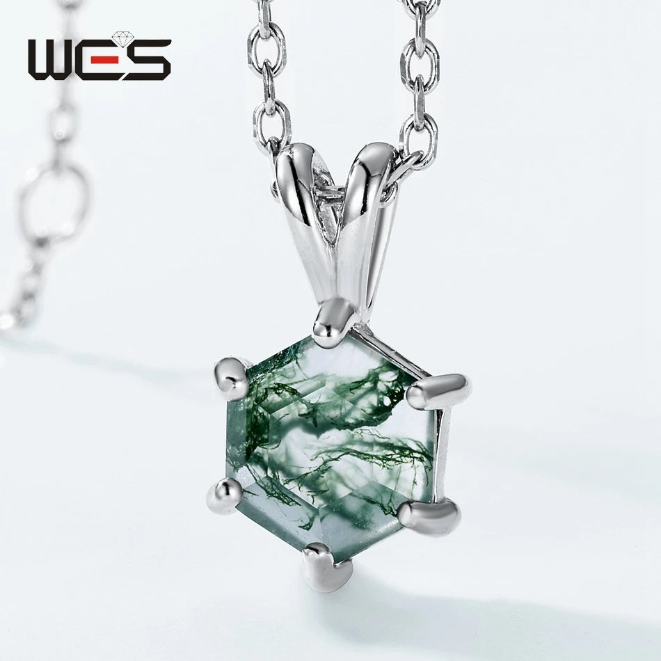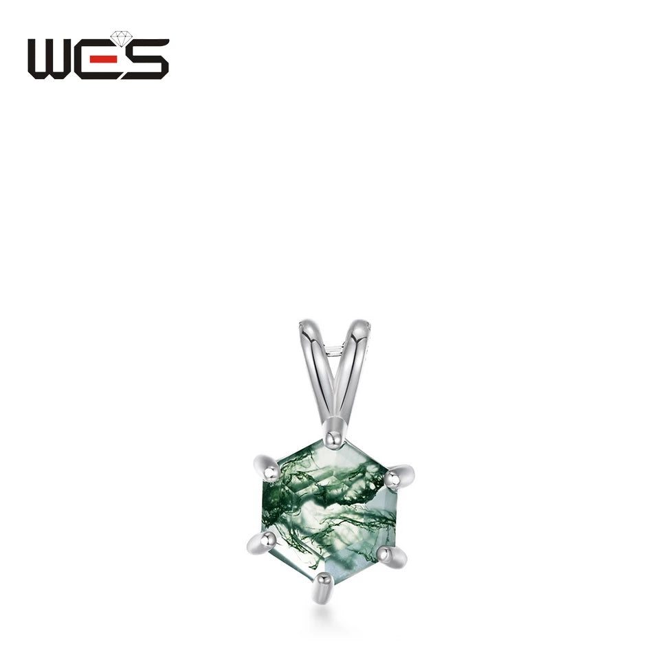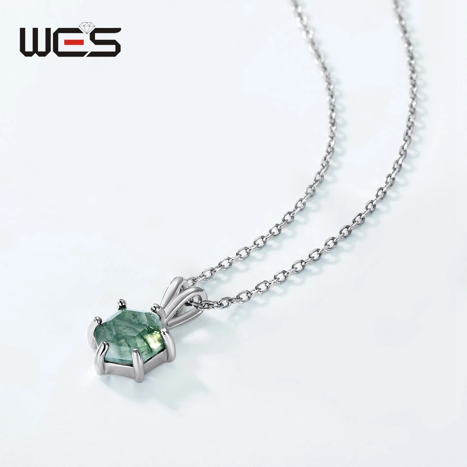 WES 925 Sterling Silver Hexagon Natural Moss Agate Pendant Necklace for Woman 7*7mm Rhodium Plated Engagement Gift Wholesale